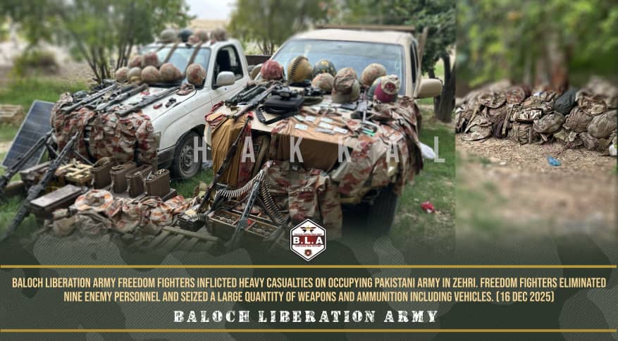 In one operation, BLA freedom fighters targeted a vehicle of occupying Pakistani Army using a remote-controlled IED in Katgari area of Panjgur district on December 17, said its spokesman Jeeyand Baooch in a statemen.